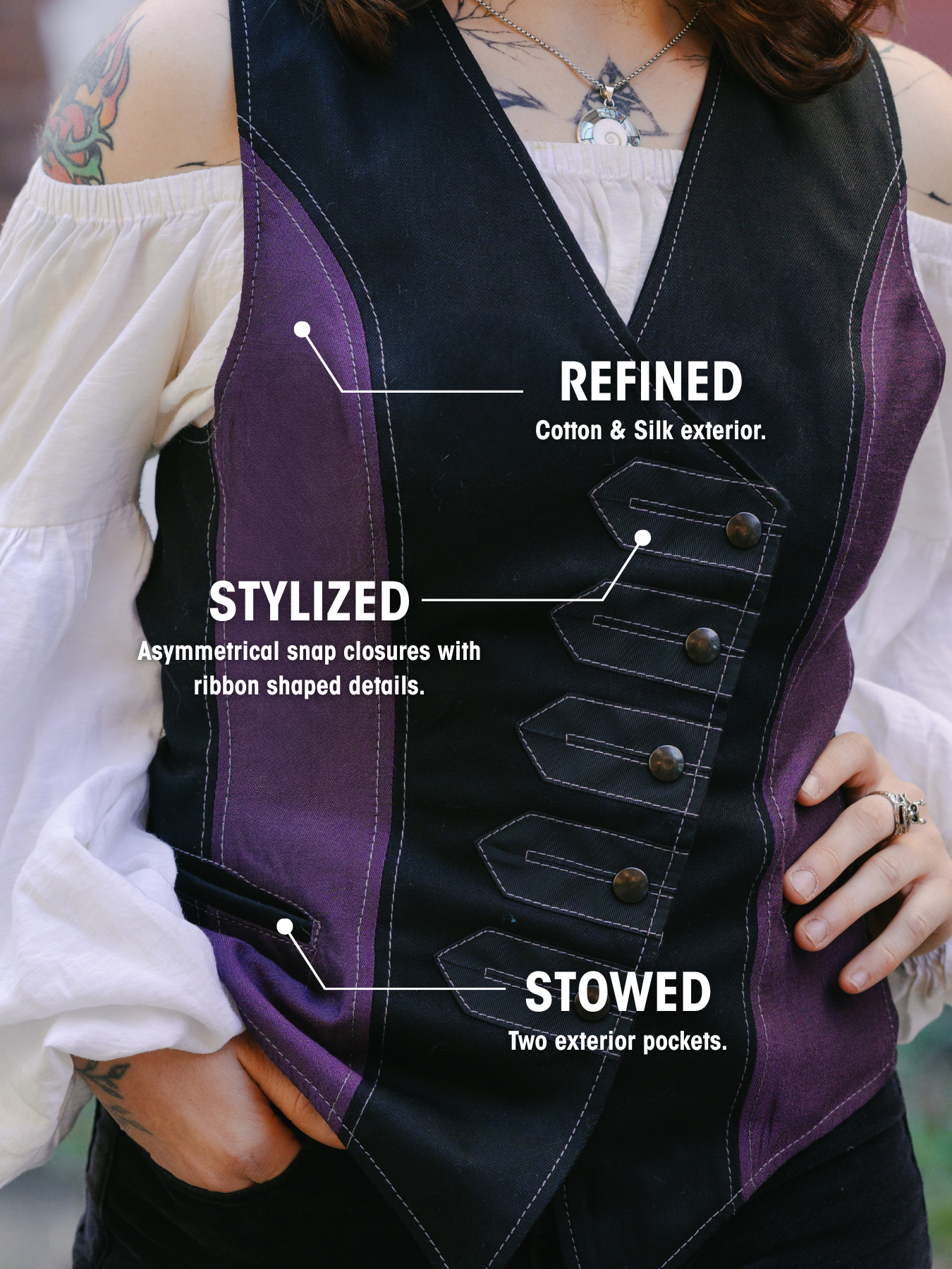The Harker Vest's asymmetrical lines and detailed ribbon accents instantly amplify your presence.