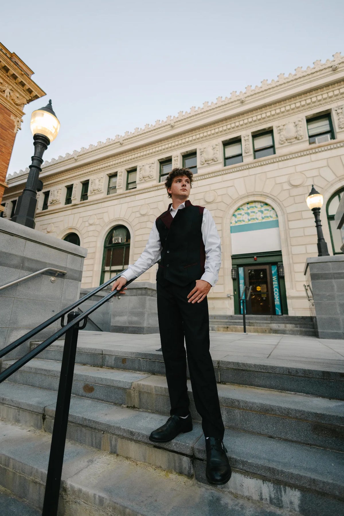 Nate is 5'8" and wearing the Viktor Vest in size 39M.